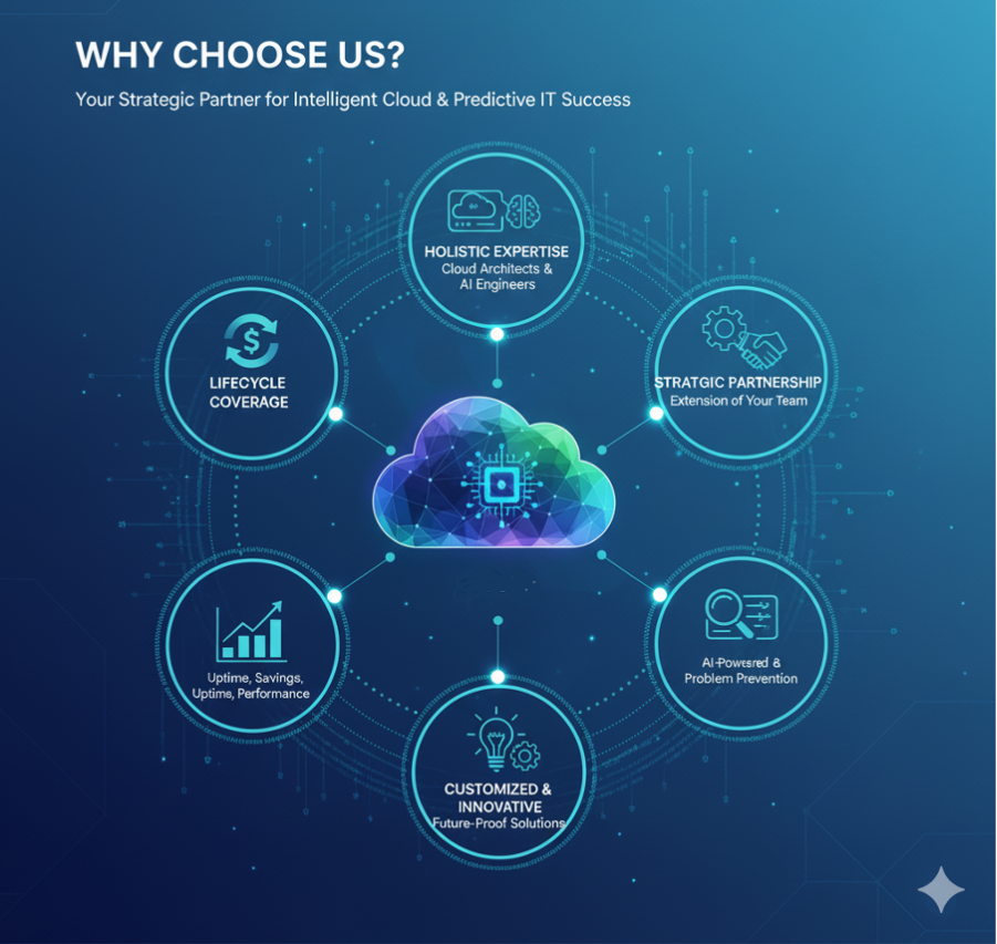 We don't just guide your cloud transformation; we make it intelligent, predictive, and resilient. Choosing us means partnering with a team that covers the entire lifecycle, from architecture to autonomous operations.