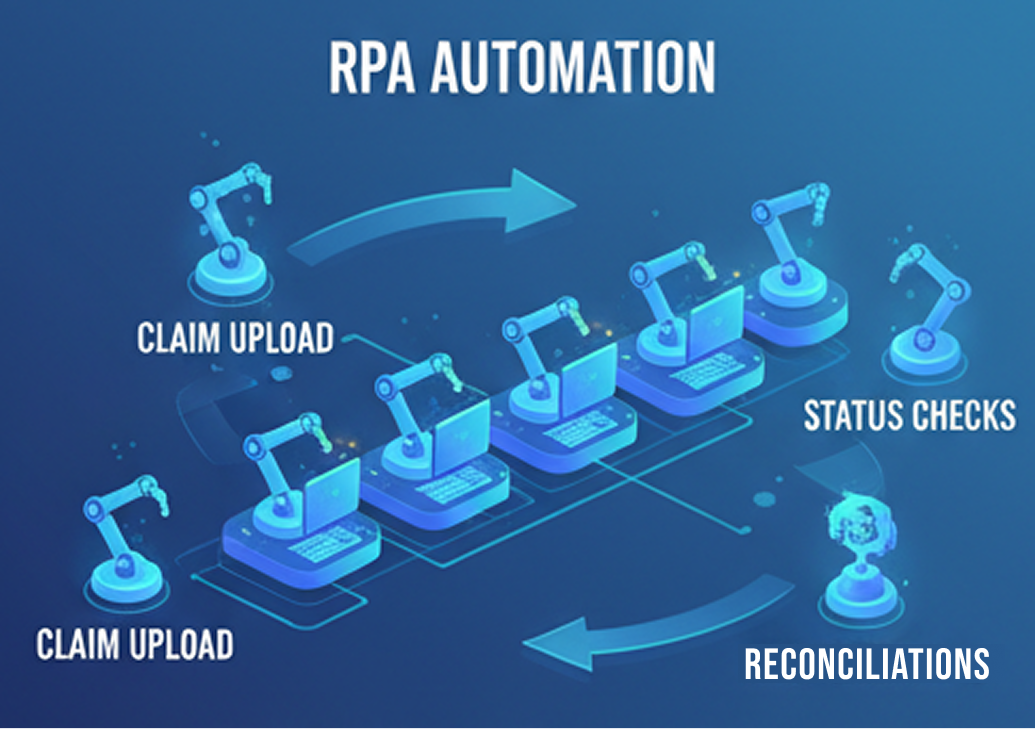 RPA bots handle repetitive workflows such as claim uploads, status checks, and reconciliations.